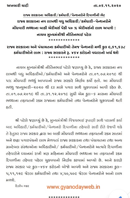 Deputy Chief Minister Nitin Patel said that the state government had decided to provide 5% inflation allowance to more than nine lakh officers / employees and pensioners of the state government from July 1, 2019. This inflation allowance is paid with salary every month from January 2020. From 1 July 2019 to 31 December 2019, the difference in the total 6-month inflation allowance was to be paid to the state employees and pensioners.